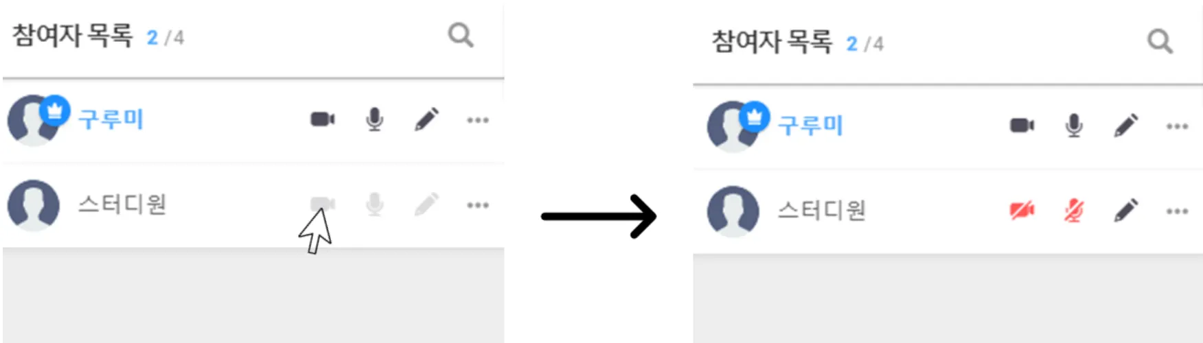 이 때, 우측 참여자 목록에 닉네임 옆 카메라 버튼이 회색으로 비활성화되어있지는 않은지 확인해주세요.