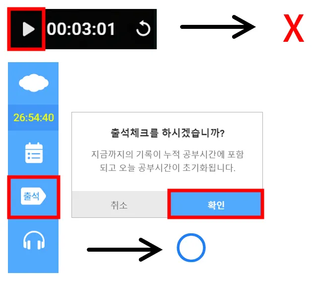 타이머 우측의 돌아가는 화살표로 공부기록 초기화 시, 어제 공부한 기록이 초기화되어 없어지게 되니 주의해주세요!