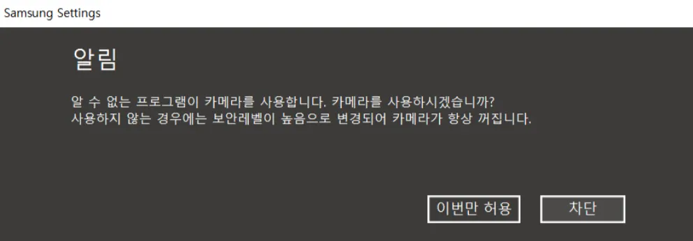 삼성 PC는 사생활 보호 등급 설정을 높게 해 놓으면 웹캠의 영상을 가져오는 부분이 차단됩니다.