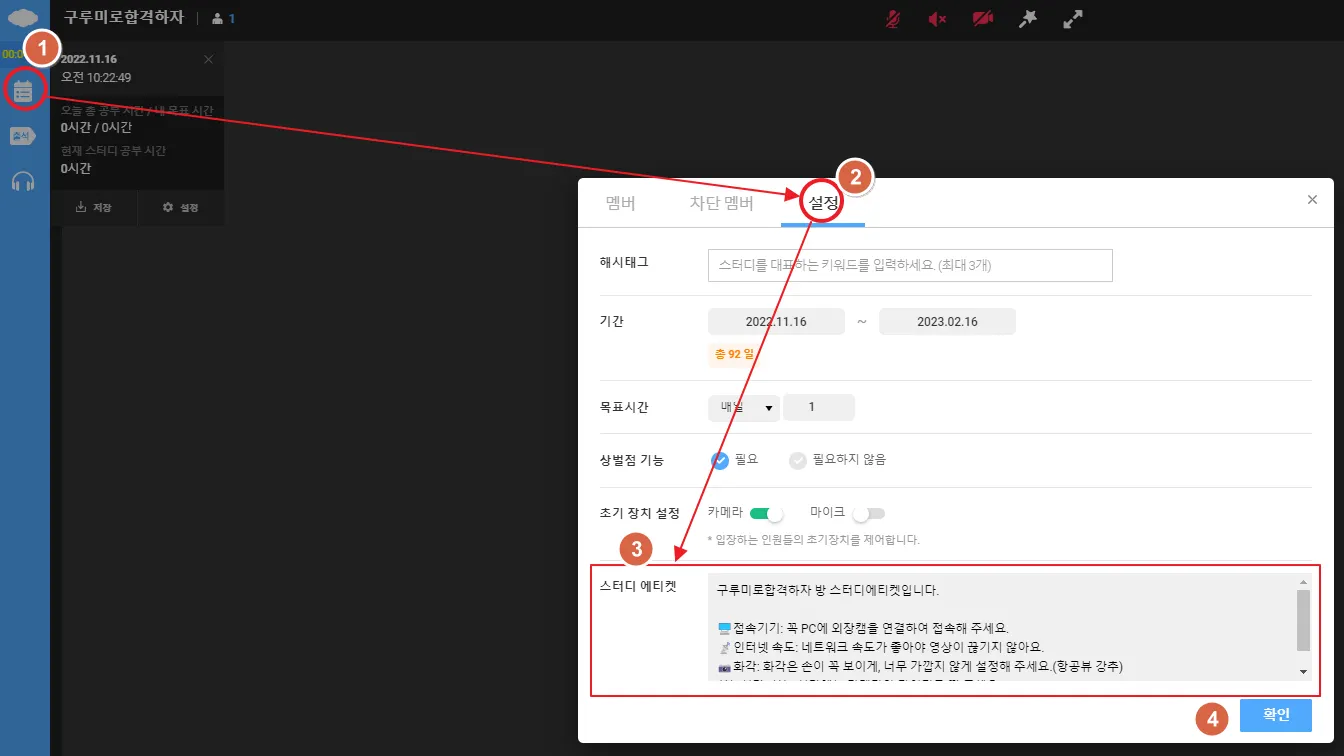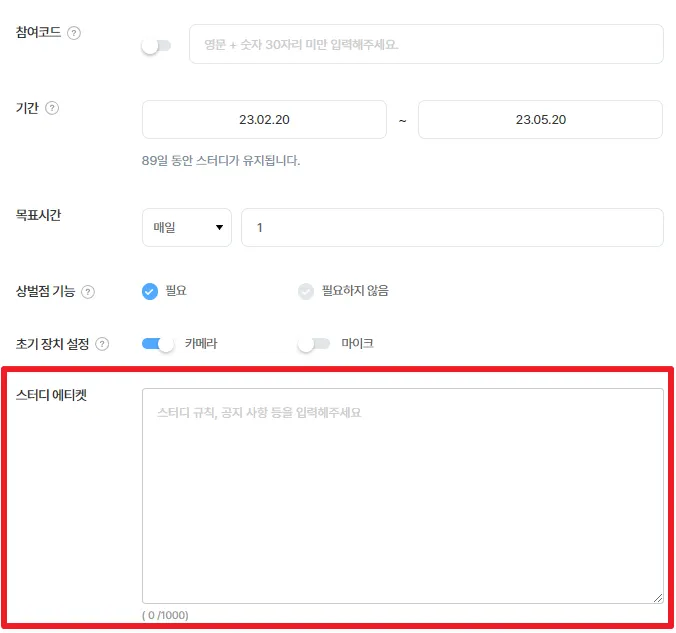 스터디 에티켓은 스터디를 처음 만들 때, 그리고 스터디룸 내 스터디 관리 - 설정에서 작성 및 수정을 할 수 있어요.