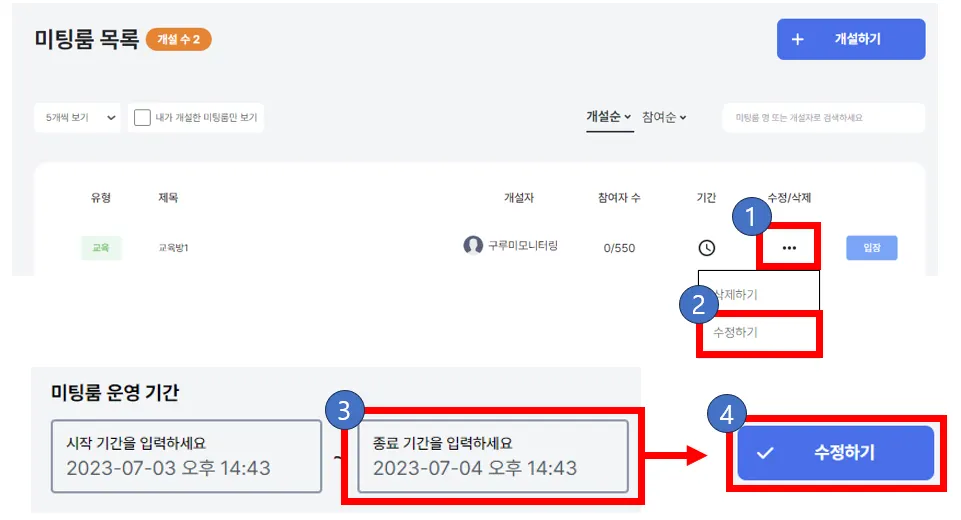 만약 미팅룸 개설 시 종료 기간 설정을 안 해주셨을 경우에는