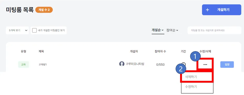 개설된 미팅룸은 개설자가 언제든지 삭제할 수 있어요.