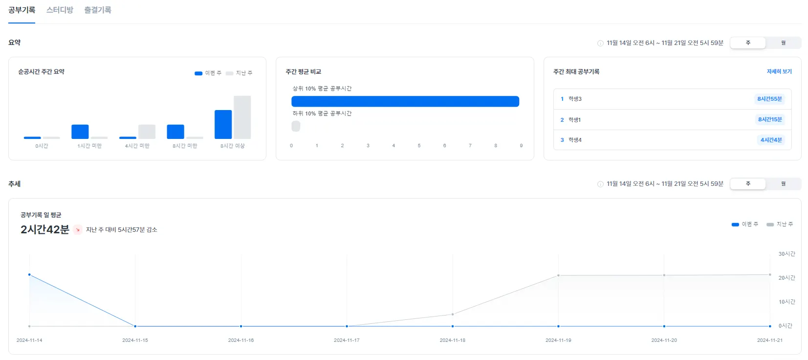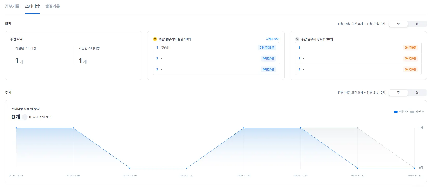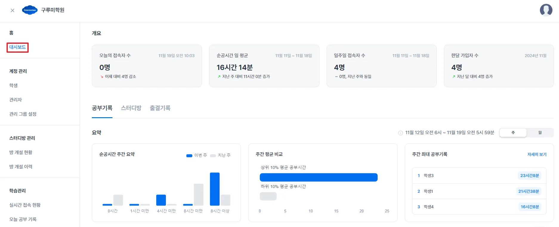 대시보드에서는 오늘의 접속자 및 가입자 수를 한 눈에 볼 수 있으며, 공부기록, 스터디방, 출결기록에 대한 요약본을 확인할 수 있습니다.
