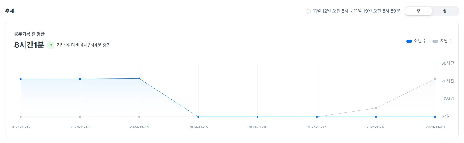 그룹의 스터디방 개설 수에 대한 주간/월간과 추세를 확인할 수 있으며, 주간/월간 공부기록 랭킹을 확인할 수 있습니다.