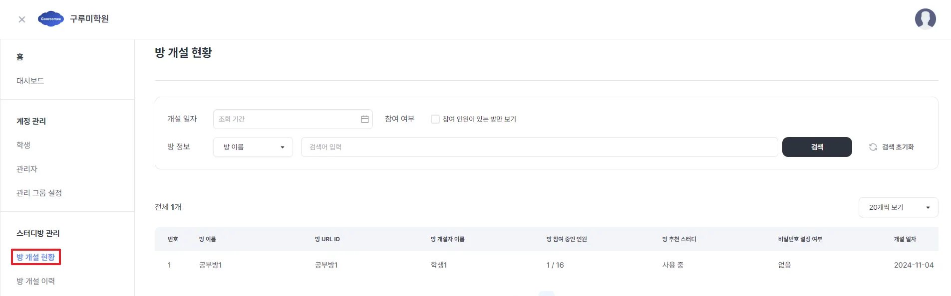 올리고 관리자 페이지 > 스터디방 관리 > 방 개설 현황