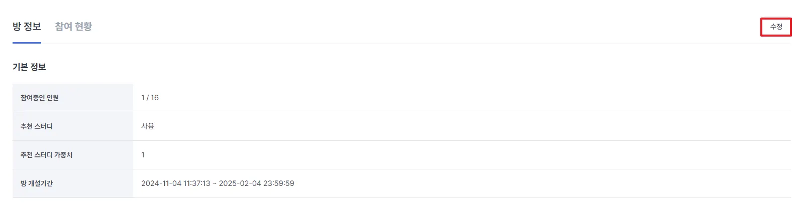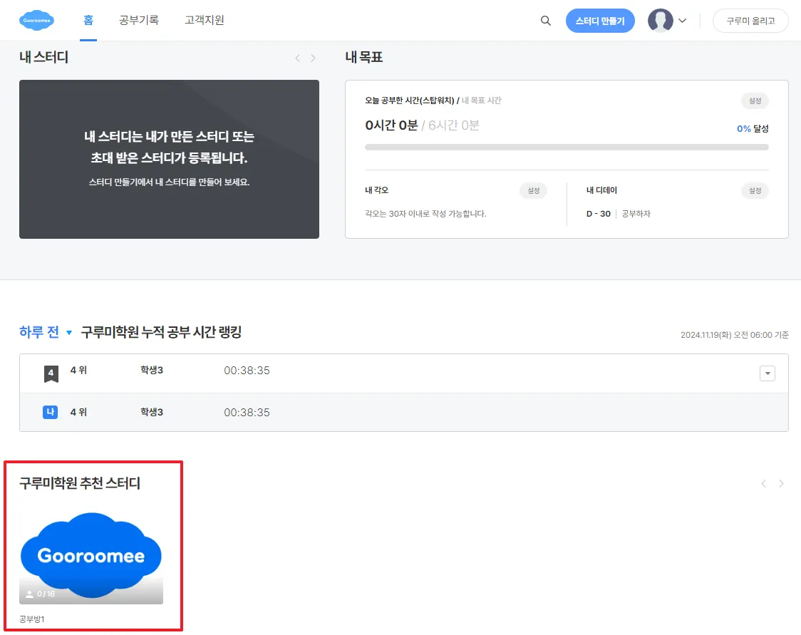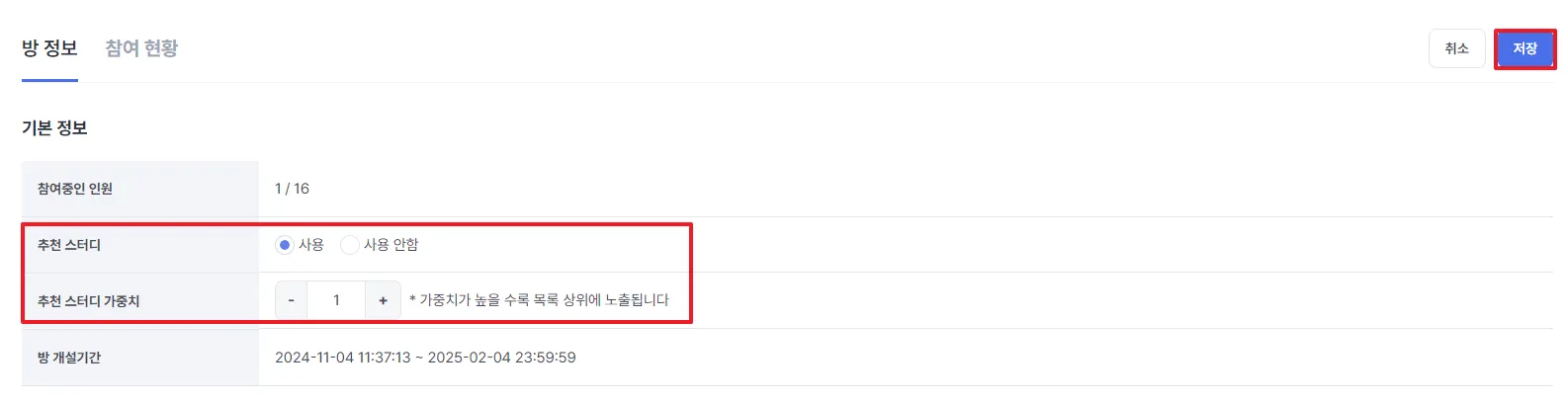 스터디방을 개설하였다면, 그룹만의 추천스터디를 설정할 수 있습니다.