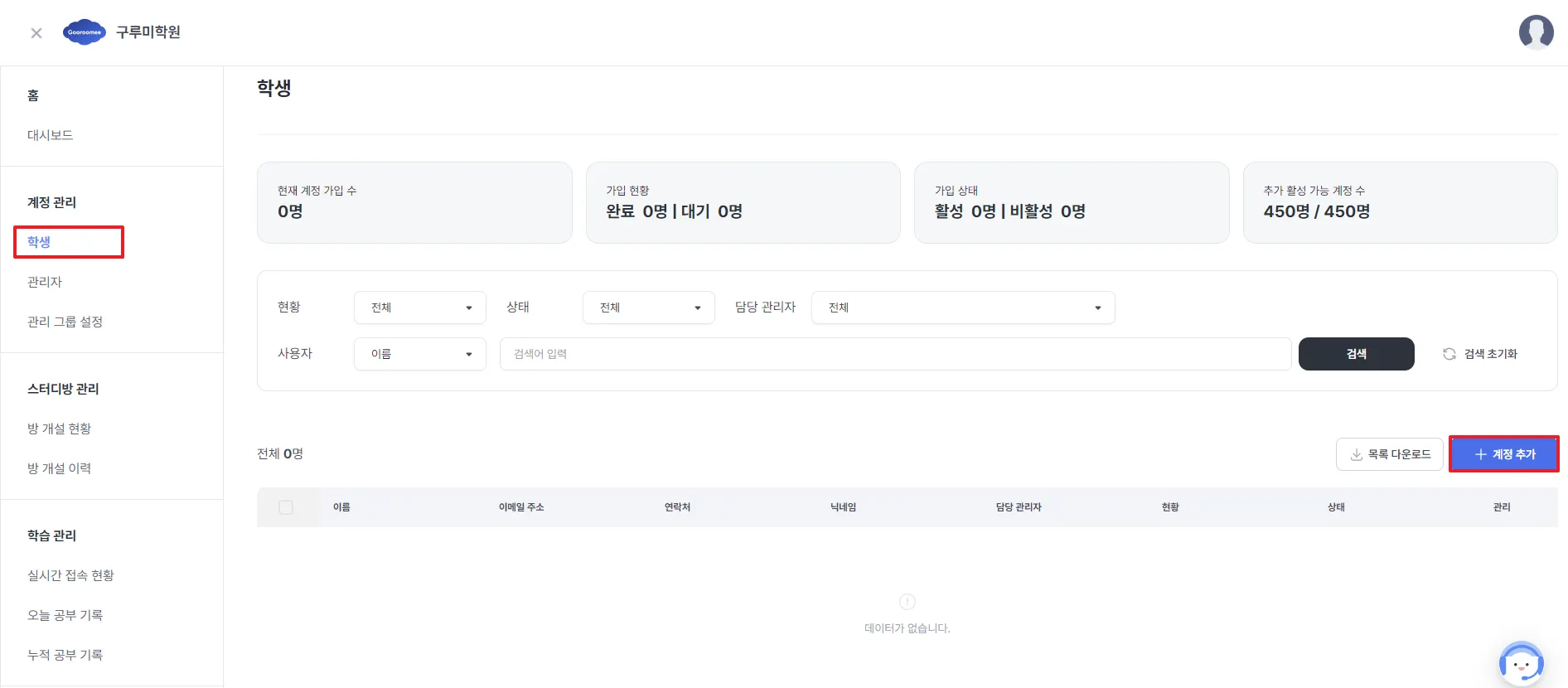 구루미 올리고 관리자 페이지 로그인 > 계정관리 > 학생