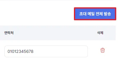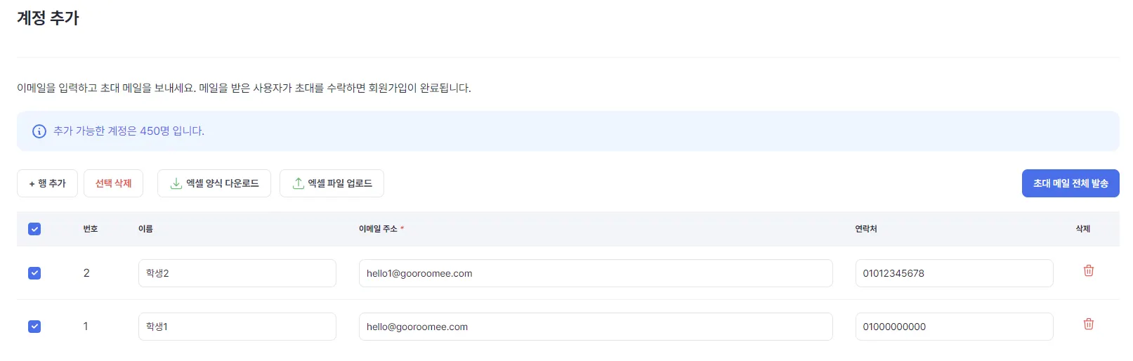 추가할 계정 정보를 모두 기입 후 ‘초대 메일 전체 발송’ 버튼 클릭
