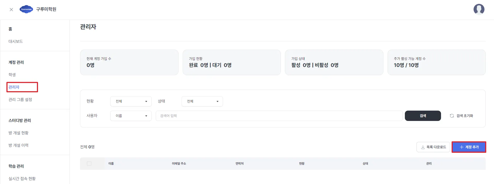 구루미 올리고를 이용하려면 학생을 초대해야 하며, 관리자를 추가로 초대할 수 있습니다.