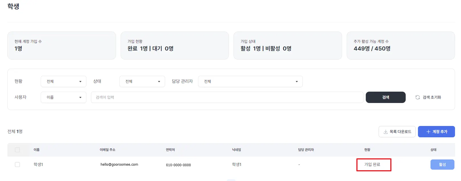 가입 진행 여부는 계정관리 > 학생 페이지에서 확인 가능