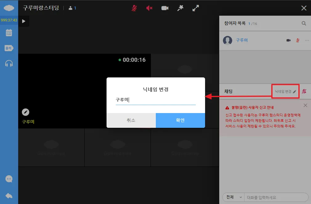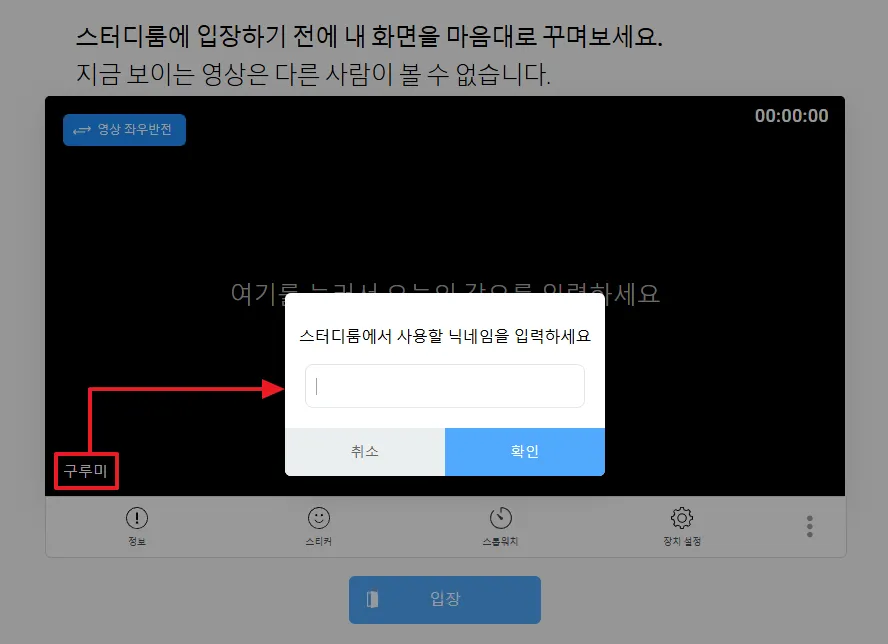 기존 스터디방에서 사용하던 닉네임을 변경하려면 ‘코디화면’이나 스터디에 입장 후 채팅창에서 변경해 주세요.