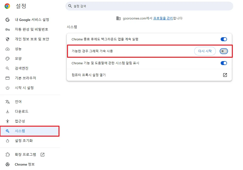 좌측 메뉴의 시스템을 클릭 후, ‘가능한 경우 그래픽 가속 사용’을 끄고 ‘다시 시작’을 눌러 주세요.
