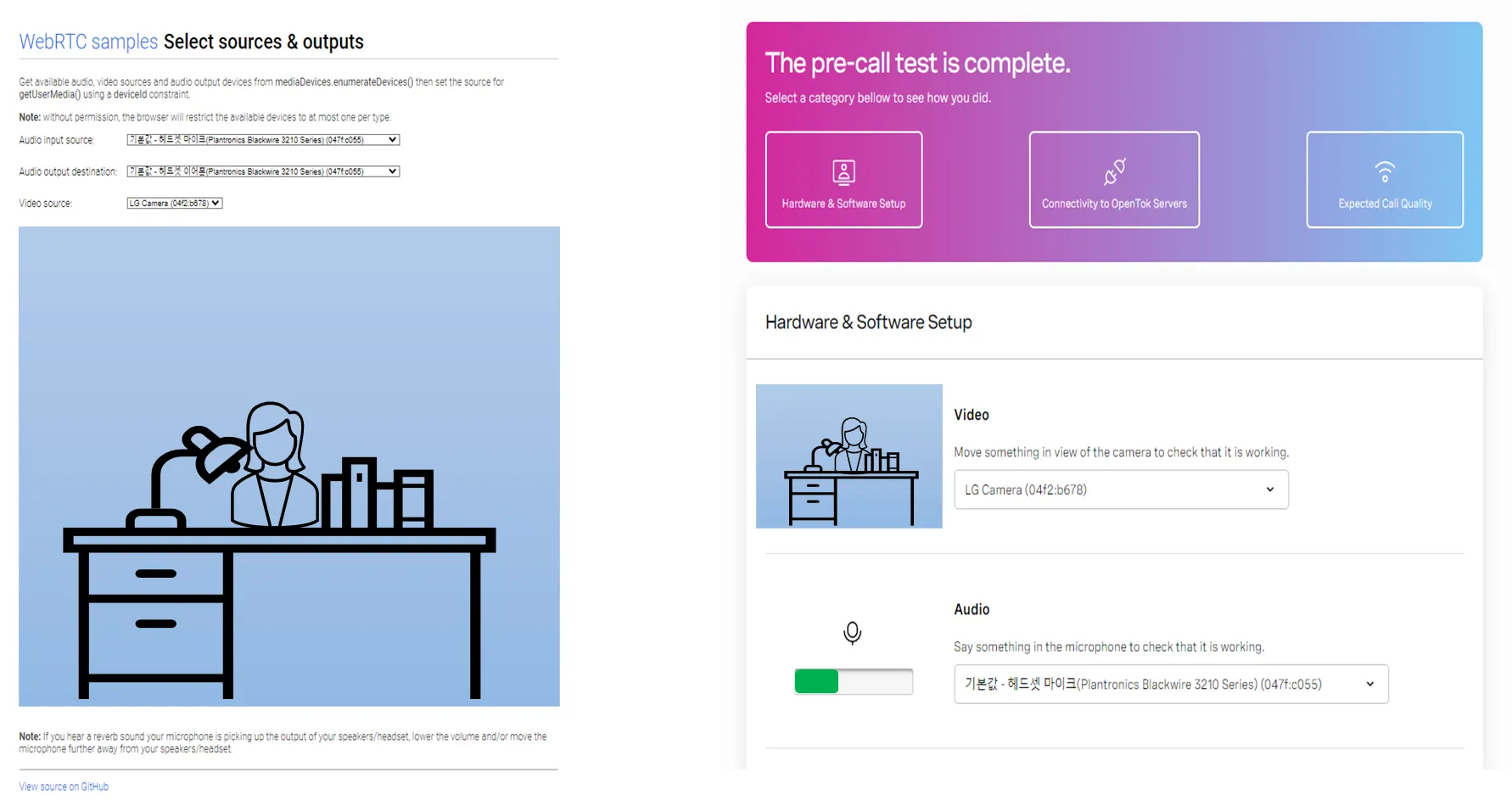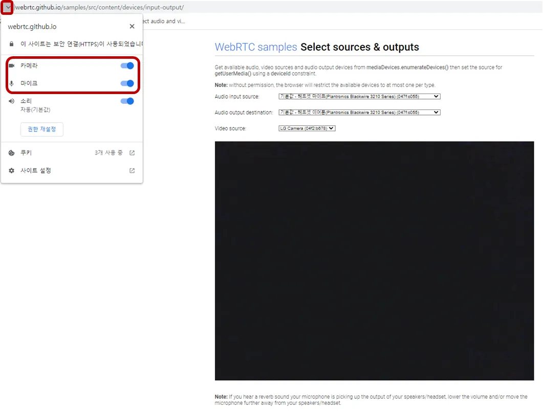 웹에서 카메라/ 마이크를 잘 불러올 경우 아래 사진처럼 나옵니다.