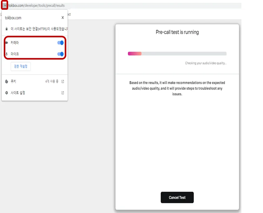 사이트에 입장한 뒤 주소창 왼쪽에 있는 사이트 정보(자물쇠 혹은 설정 아이콘) 을 클릭해 카메라/ 마이크 허용을 눌러주셔야 합니다.