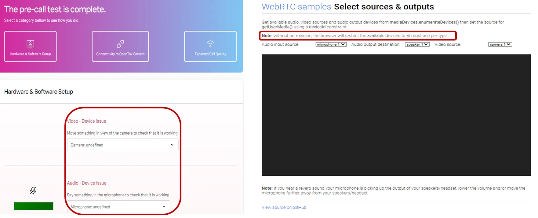 웹에서 카메라/마이크 장치를 불러올 수 있는 지를 확인해 주세요.
