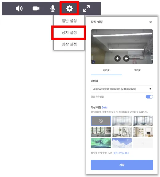 입장한 미팅룸 상단 톱니바퀴 버튼 > 장치 설정 버튼을 눌러 카메라 영상이 나오는지 확인해 주세요.