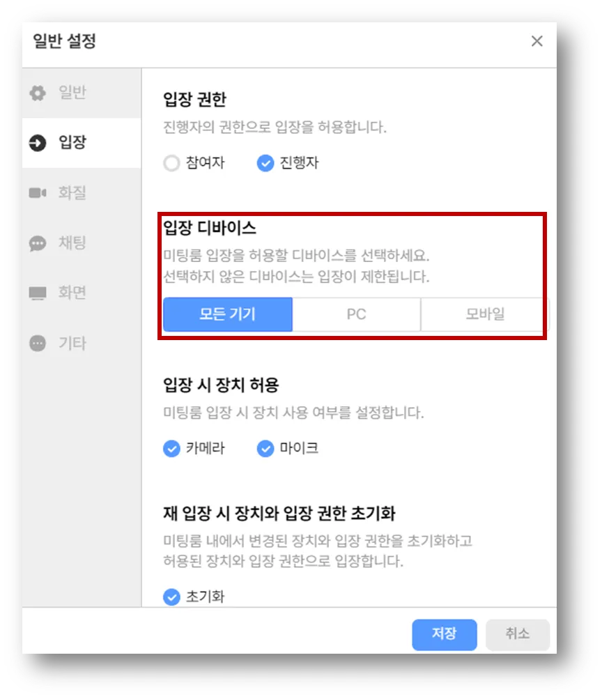 Q. 미팅룸에 입장할 수 있는 기기를 제한할 수 있나요?