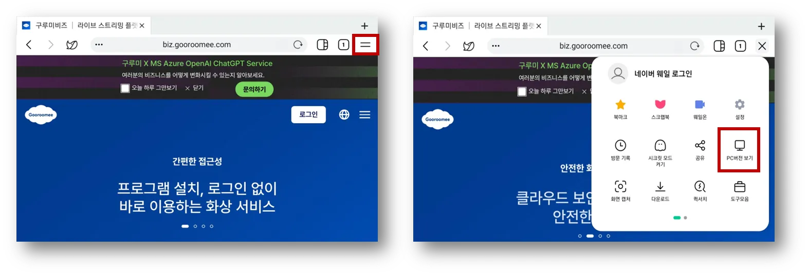 이처럼 PC만 입장 가능한 방에 태블릿PC로 입장할 때 입장이 제한된다면, 각 인터넷 브라우저를 데스크톱 버전으로 변경해 주시면 입장이 가능합니다.