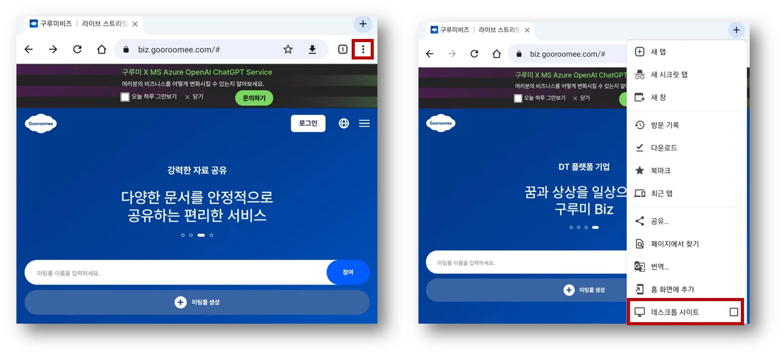 우측 상단의 [점 세 개]를 눌러 [브라우저 설정]을 연 후 [데스크톱 사이트]를 클릭하여 활성화합니다.