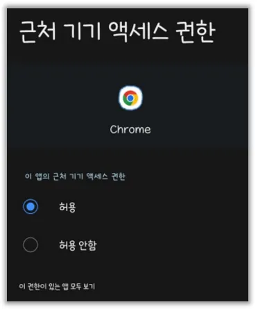 구루미에서 확인 결과 일부 종류의 기기에서 크롬 어플에게 근처기기(블루투스 기기) 권한을 묻지 않