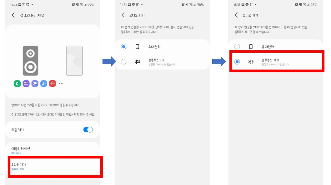 안드로이드 기기에서 연결된 블루투스 장치가 아닌 휴대폰 스피커로 송출이 되는 경우가 있습니다.