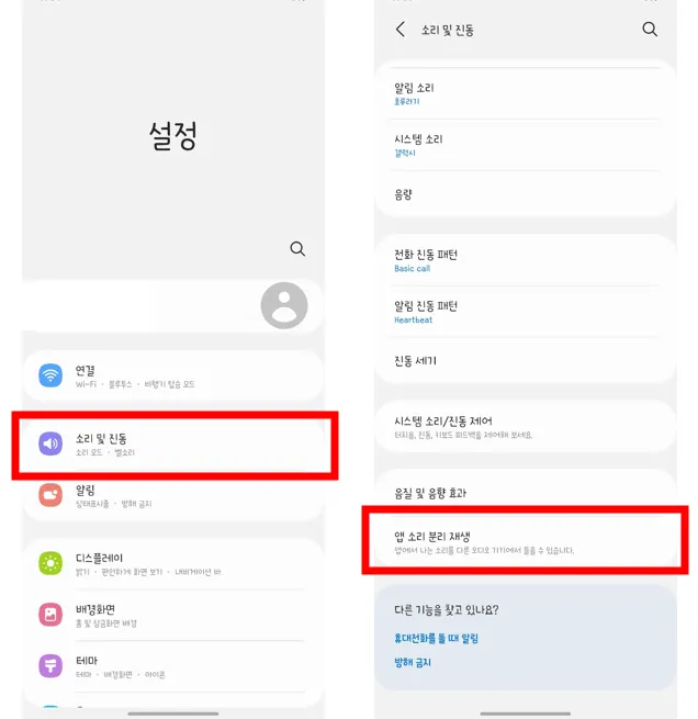 우선 휴대폰 설정 - 소리 및 진동 - (앱 소리 분리 재생 / 고급 설정-앱 소리 분리 재생) - 사용으로 되어있는지 확인 부탁드립니다.