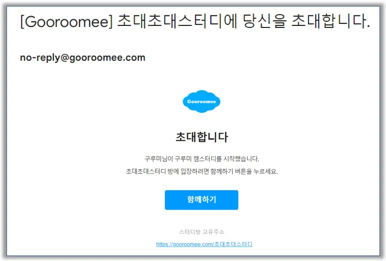 초대받으신 이메일 주소가 구루미에 가입되어 있는 주소가 아닐 경우에는 링크를 클릭하셔도 스터디룸이 아닌 구루미 홈 화면으로 접속됩니다.