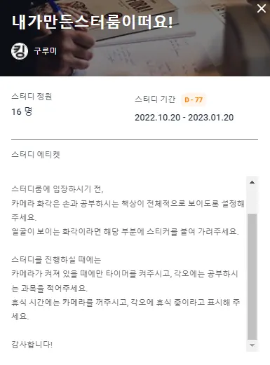네이버 카페나 다른 곳을 통하여 스터디를 구하셨다면 모집 글에 에티켓이 적혀있을 수 있으니 확인해 주세요.