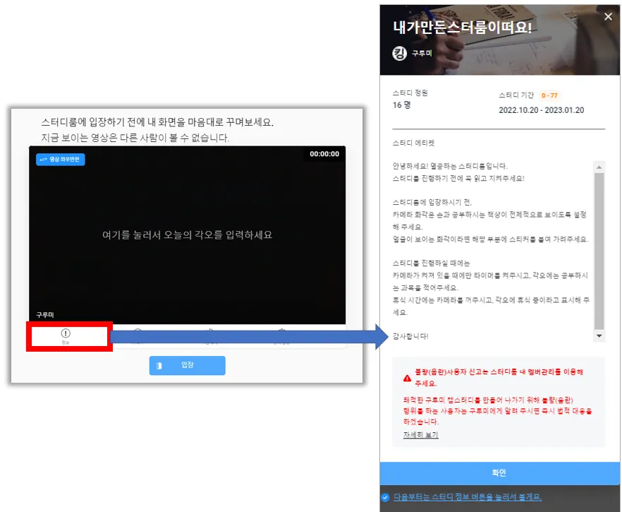 에티켓은 스터디룸 입장 전 코디 화면에서 정보를 클릭하시면 확인이 가능해요.
