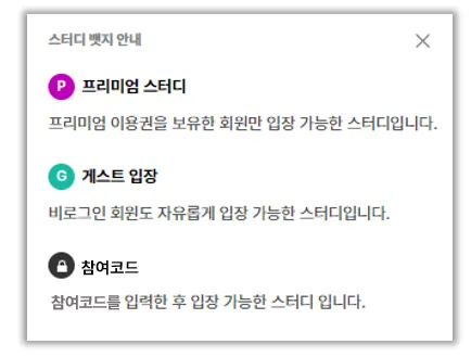 자물쇠가 붙어있는 스터디룸은 참여코드가 걸려있는 스터디룸입니다. 참여코드를 입력 후 입장이 가능합니다.