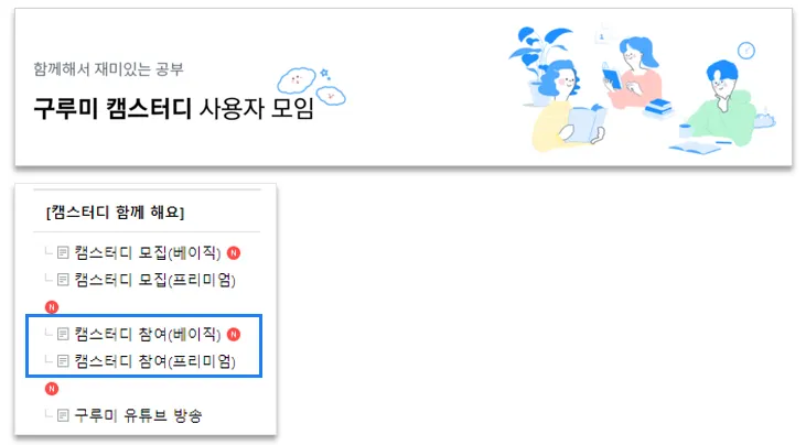 구루미 네이버 카페의 [캠스터디 함께 해요] 게시판에 있는 캠스터디 참여 (베이직)과 캠스터디 참여 (프리미엄) 게시판으로 들어가 원하는 스터디룸을 찾을 수 있어요!