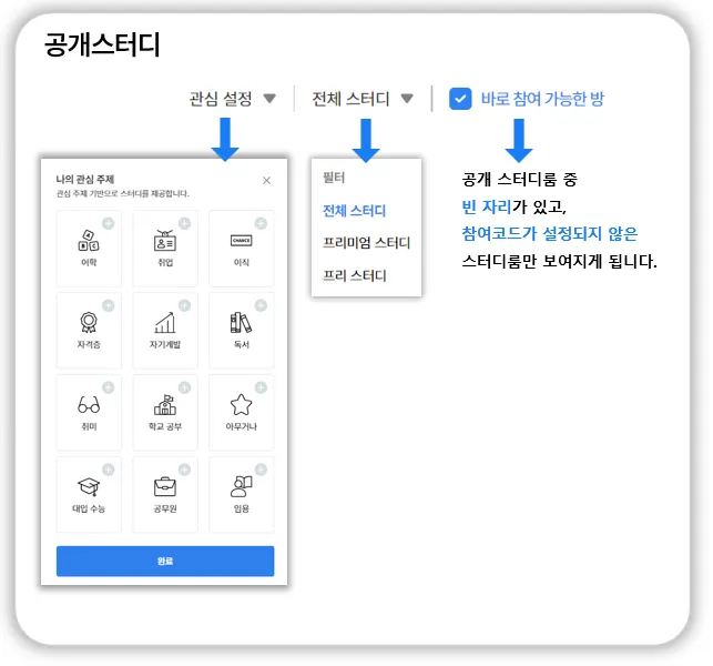 빈 자리가 있고, 참여코드가 없어 바로 입장이 가능한 스터디룸만 확인할 수 있습니다.