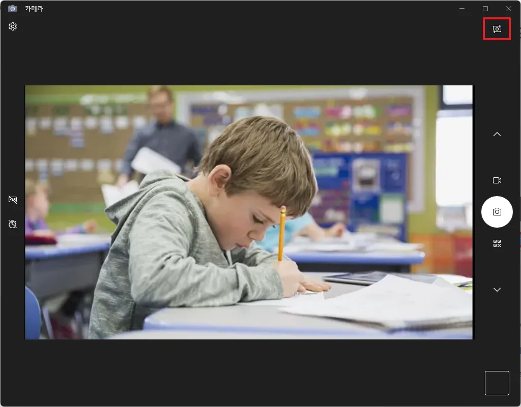 윈도우 : 윈도우 검색창에 '카메라'라고 검색 후, 카메라 앱 실행 → 외장 카메라 사용 시, 오른쪽 상단에 있는 카메라 전환 아이콘 눌러 카메라 변경