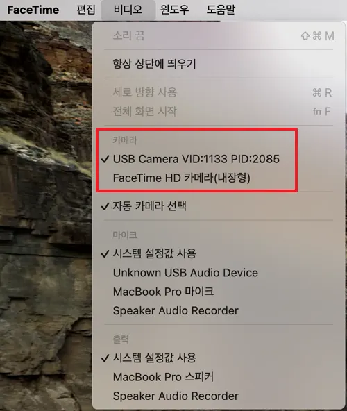 맥 : 페이스타임(FaceTime) 앱 실행 → 외장 카메라 사용 시, 비디오 > 카메라 메뉴에서 사용하고자 하는 카메라 선택