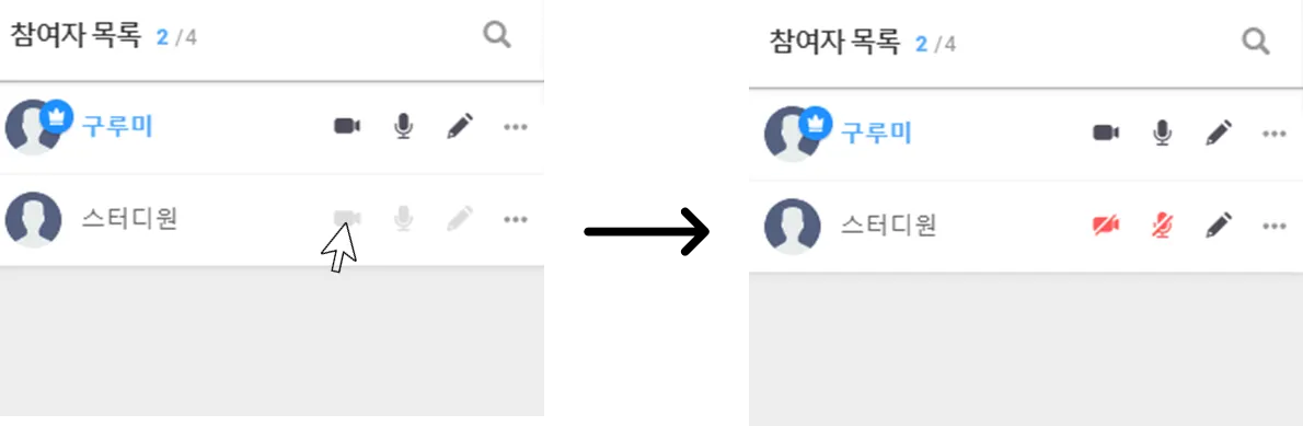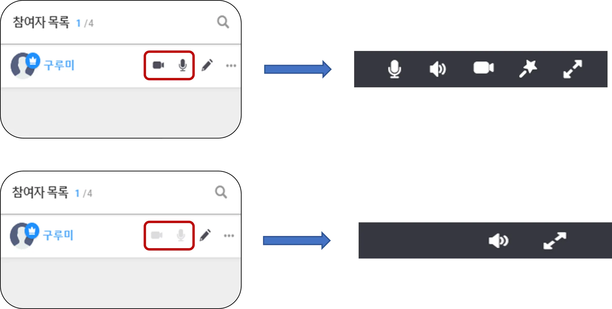 상단의 회색 바에 사용해야 하는 아이콘이 없을 경우, 카메라나 마이크에 대한 권한이 없는 상태로, 참여자 목록에서 해당 아이콘이 회색으로 표시됩니다.