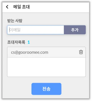 이메일 주소 란에 교육기관에서 안내받으신 로그인 아이디 주소를 입력하시고 초대자 목록에 추가하신 뒤 전송 버튼을 누르면 초대가 완료되며 미팅룸 목록에 뜨게 됩니다.