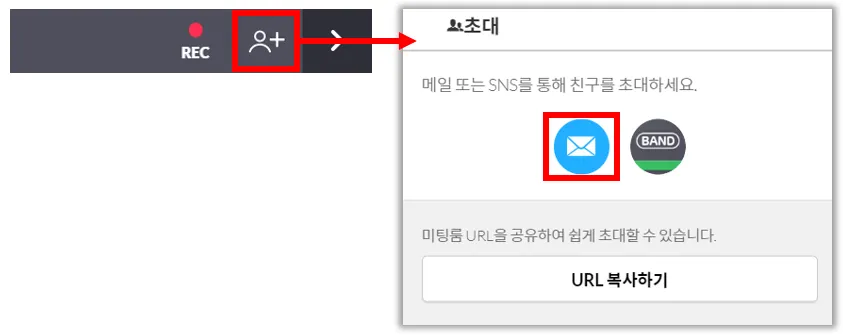 해당 미팅룸이 미팅룸 목록에 뜨길 원하신다면, 방에 입장하신 후, 우측 상단 초대 버튼을 클릭하고 이메일을 클릭합니다.