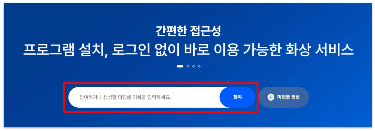 화면 중앙의 미팅룸 이름 입력 란에 해당 미팅룸 이름을 입력 후 참여 버튼을 누릅니다.