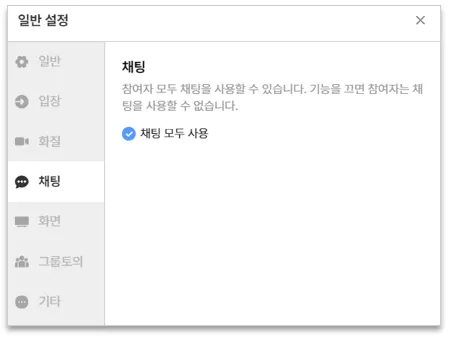 해당 기능을 켜면 모두가 채팅 기능을 사용이 가능하고, 끄면 참여자는 채팅 기능을 사용할 수 없습니다. (역할 권한이 발표자, 진행자, 교사, 조교일 경우 사용할 수 있습니다.)