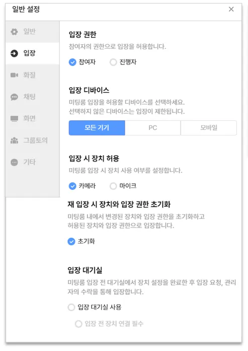 : 미팅룸 입장을 할 수 있는 디바이스를 설정할 수 있습니다. 선택한 디바이스가 아닐 경우 입장이 불가합니다.