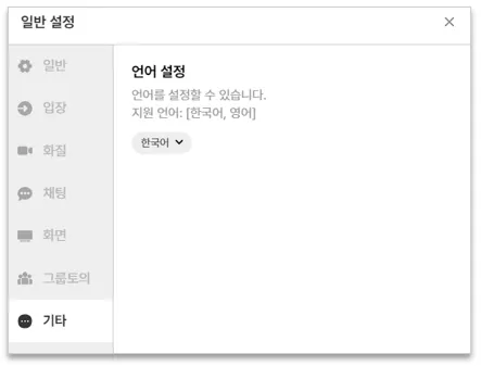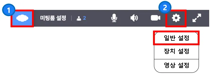 미팅룸 설정을 위해 좌측 상단 구름모양 아이콘 또는 상단 톱니바퀴 모양을 눌러 일반 설정을 열어주세요.