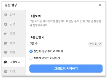 그룹토의란 미팅룸 안에서 여러 그룹을 만들어 소그룹 토의를 진행할 수 있는 기능입니다.