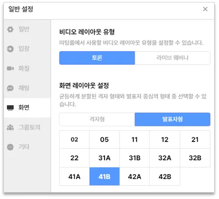 : 미팅룸에서 사용할 화면 레이아웃을 설정할 수 있습니다.