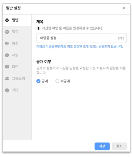 : 개설한 미팅룸 이름을 변경할 수 있습니다. 미팅룸 이름을 변경해도 최초 생성된 초대 링크(URL 주소)는 변경되지 않습니다.