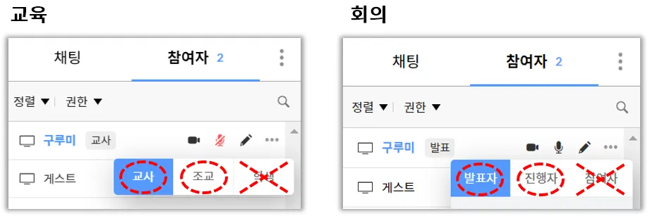 : 미팅룸에 입장할 유저들의 역할 권한을 설정할 수 있습니다. (진행자/조교, 참여자/학생)