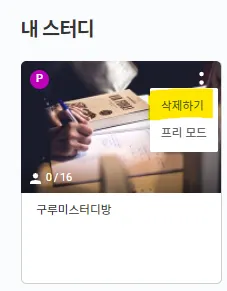 내스터디 목록에서 삭제할 스터디룸 오른쪽 상단 점3개 아이콘을 눌러 주세요.