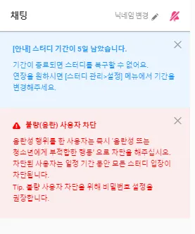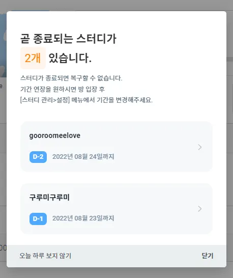 스터디 기간을 설정한 후, 종료일이 다가오면 홈페이지에서 팝업창이 뜹니다. 스터디방 입장 후 채팅창에서도 종료일이 다가오는 스터디에 대한 정보를 볼 수 있습니다.