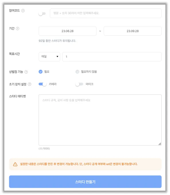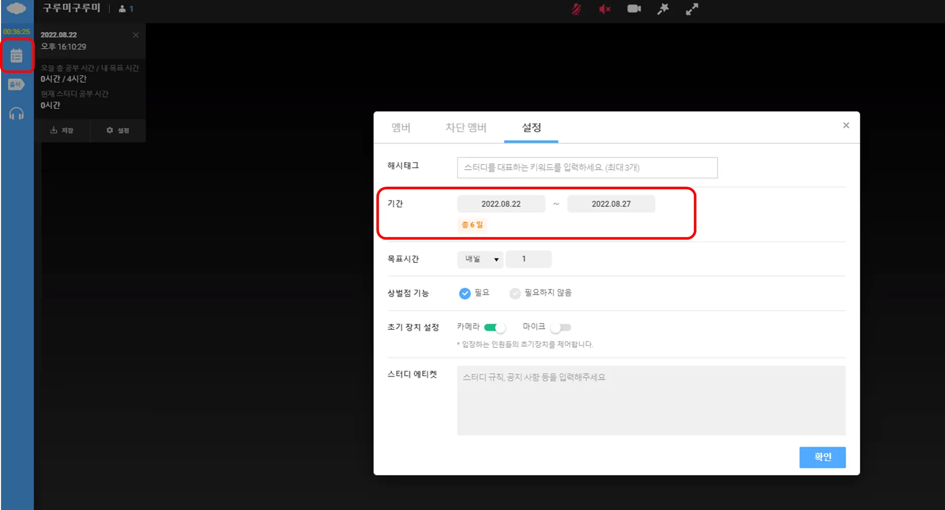 기간 : 스터디의 유지 기간을 설정할 수 있습니다.