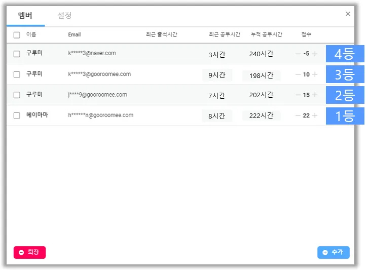 공개 스터디룸에서는 현재 입장해 있는 스터디원들의 공부시간만 확인이 가능합니다.