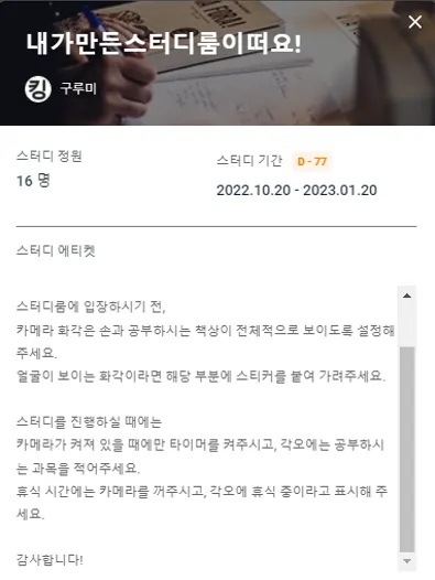 변경 방법 : 스터디룸 내부 - 좌측 메뉴 바에 ‘스터디 관리’ - 설정 - 에티켓 부분 수정 - 확인 버튼